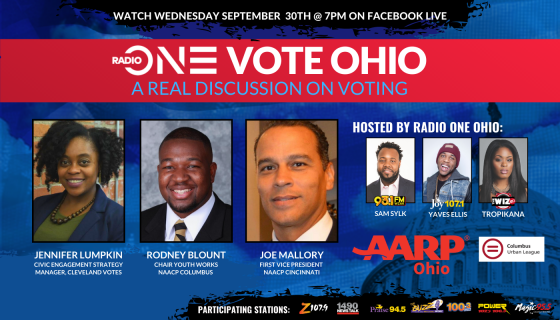 2020 is a year of change… and you are the change that’s needed! Join us on our Facebook pages for One Vote Ohio – a real discussion on voting Wednesday, September 30th at 7pm. Join Joy 107.1’s very own Yaves Ellis, Sam Sylk of Cleveland’s 93.1 WZAK and Tropikana of Cincinnati’s 101 The Wiz along with surprise celebrity guests! Remember – one vote is better than no vote! We’ll be live on Facebook and YouTube to discuss Trump, Biden and everything Cleveland you need to know for November 3rd! Your vote counts! One Vote Ohio is powered by AARP Ohio and Radio One Ohio.