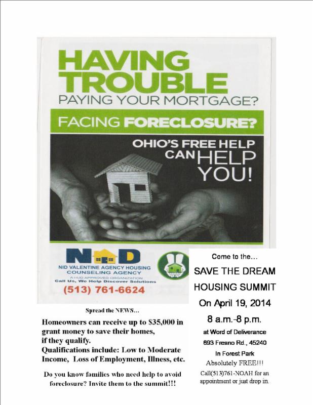 DON’T MISS IT – Saturday, April 19! 8 am to 8 pm “SAVE THE DREAM HOUSING SUMMIT” Find out your eligibility to receive up to $35,000 in grant money to save your home. ABSOLUTELY FREE – Light refreshments. at Word of Deliverance 693 Fresno Road, 45240 in Forest Park […]