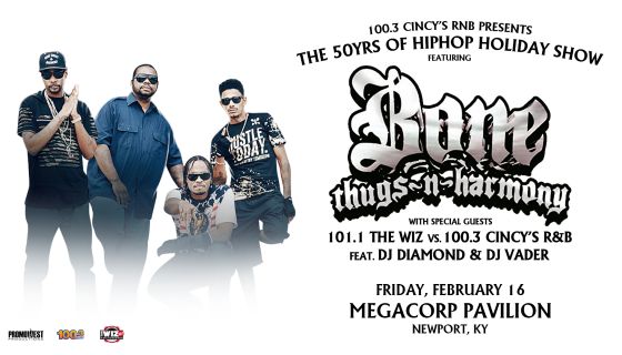 We’re kicking the year off strong with 50 hip years of hip hop! Join us for Bone Thugs-N-Harmony, the hip hop legends from the Land, hitting the Tri-State on February 16th at MegaCorp Pavilion — featuring a LIVE DJ battle between 100.3’s DJ Vader Mix, and 101.1’s DJ Diamond!